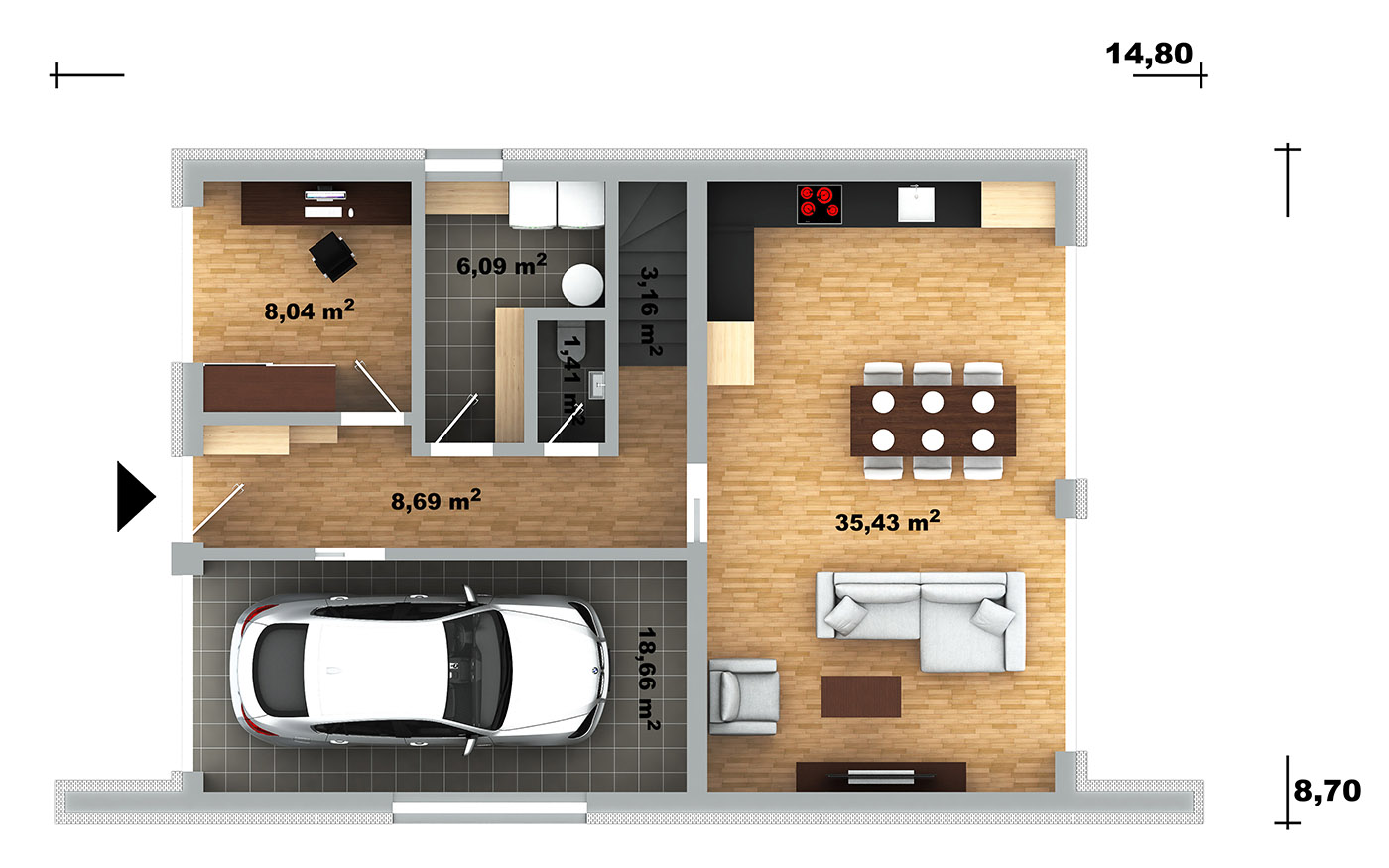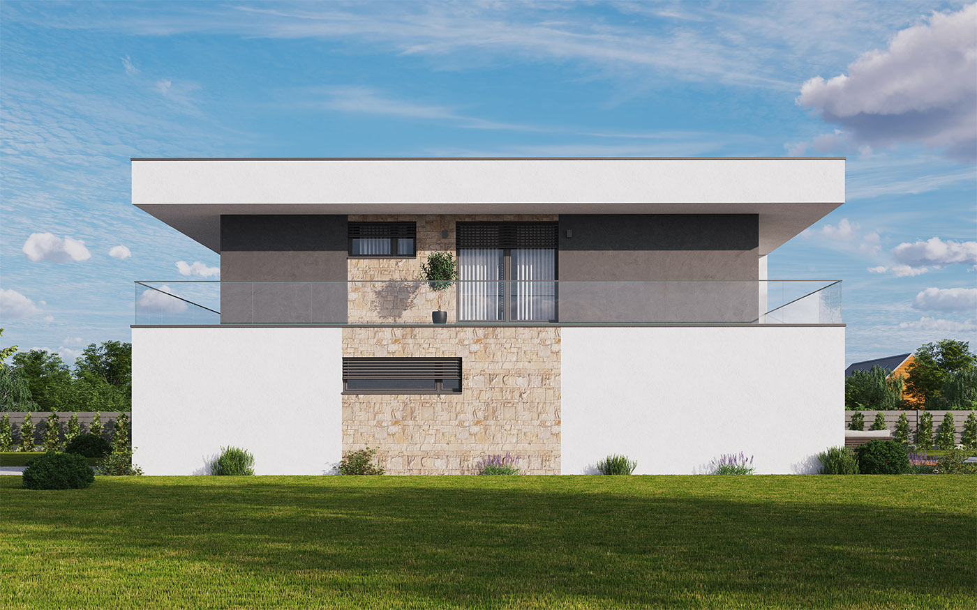 W domu znajduje się również duże pomieszczenie gospodarcze, w którym jest wystarczająco dużo miejsca, aby pomieścić całą technologię. Dom będzie pokryty płaskim dachem.