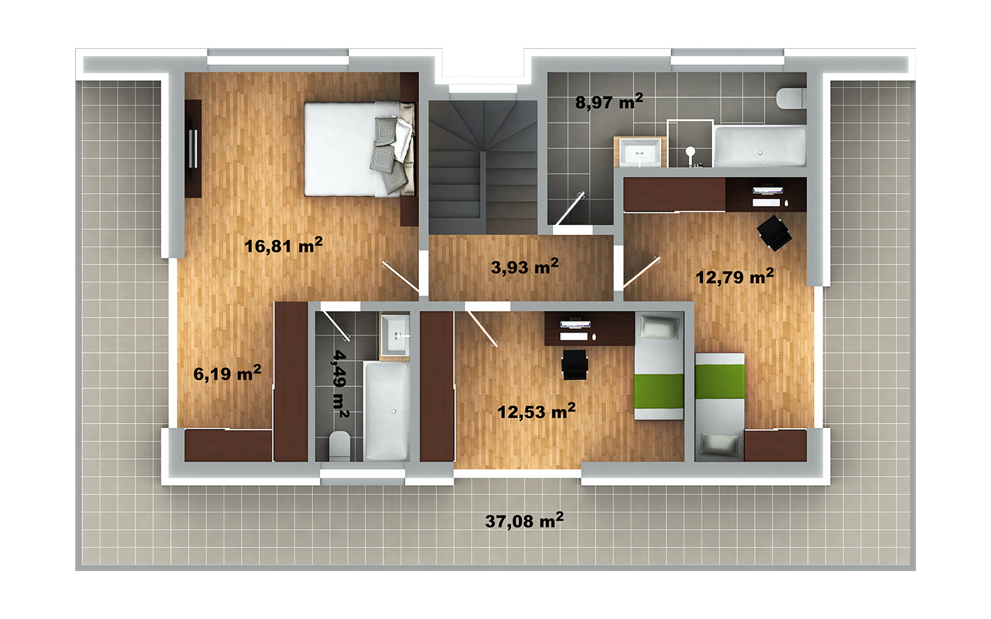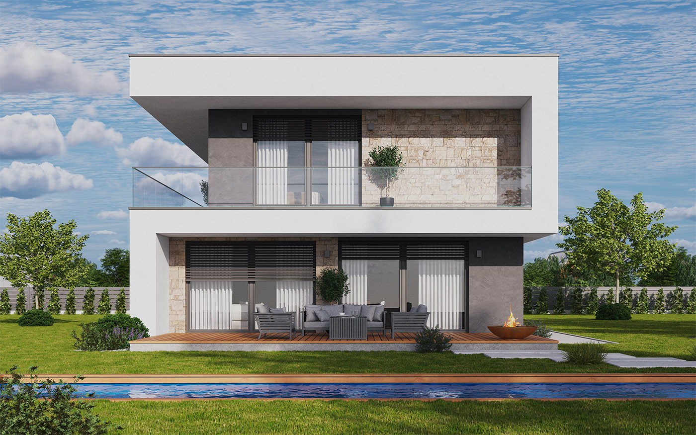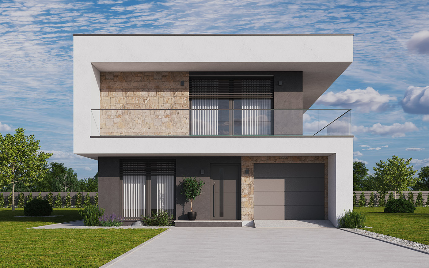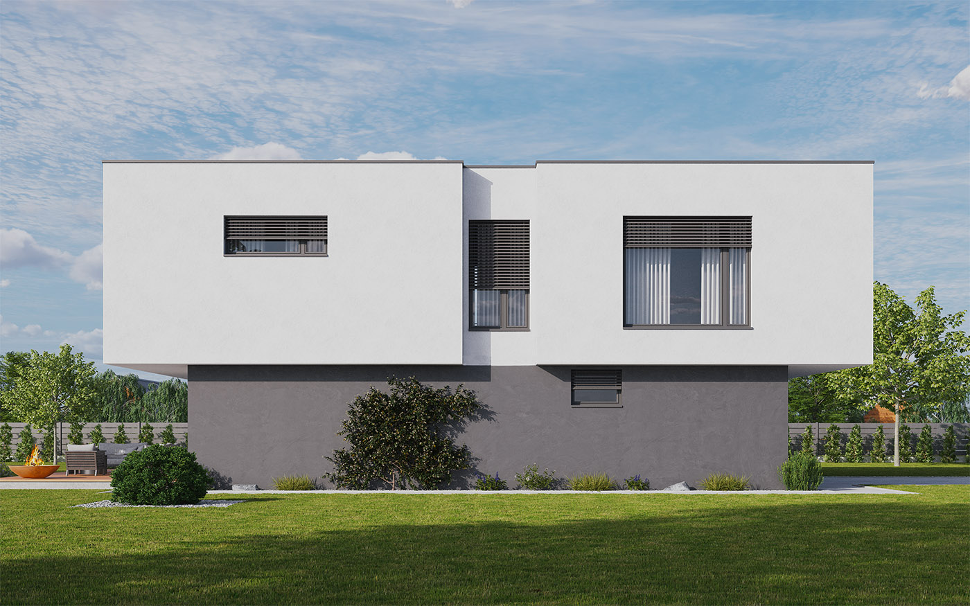 Na pierwszym piętrze znajdziemy pokój dzienny z aneksem kuchennym, gabinet oraz wydzieloną toaletę. Na drugim piętrze znajduje się strefa wyciszenia, w której znajdują się dwa pokoje dziecięce, łazienka z WC, sypialnia z oddzielną łazienką oraz garderoba.