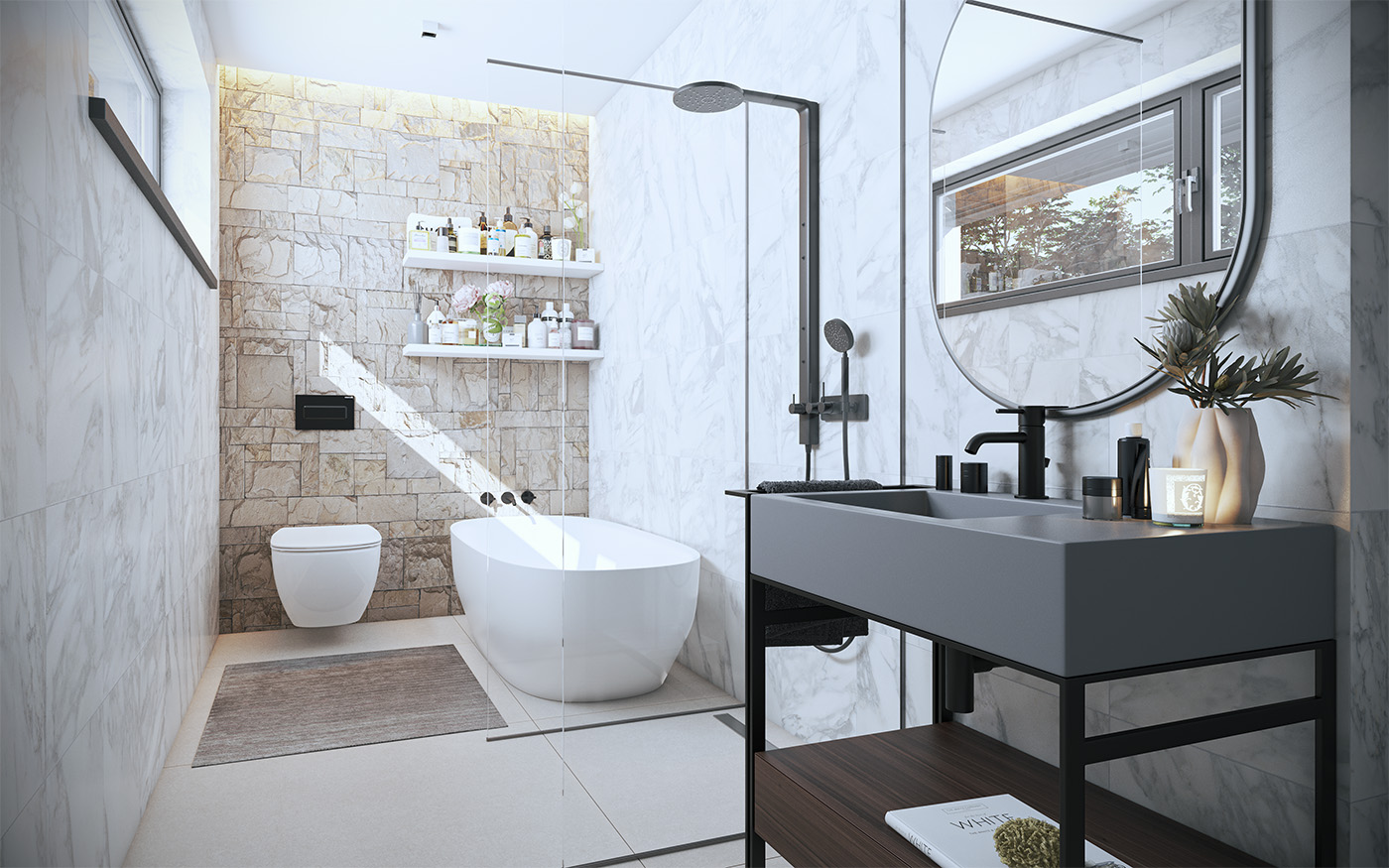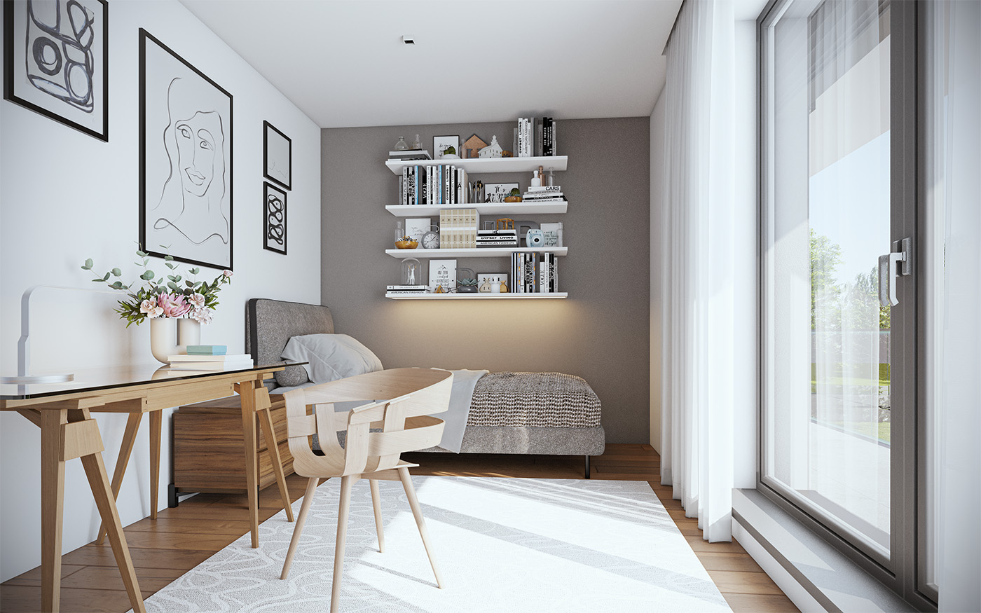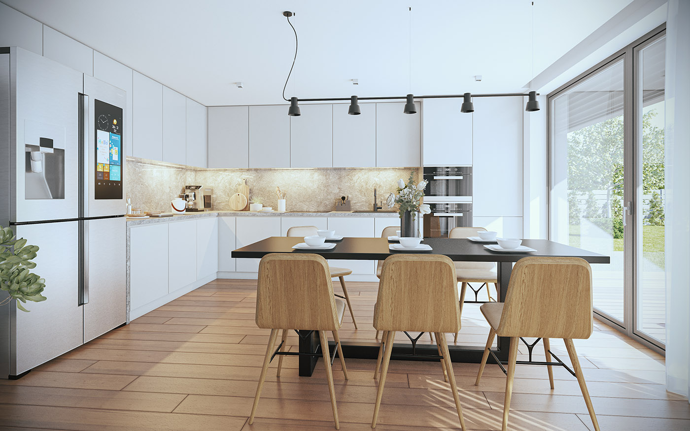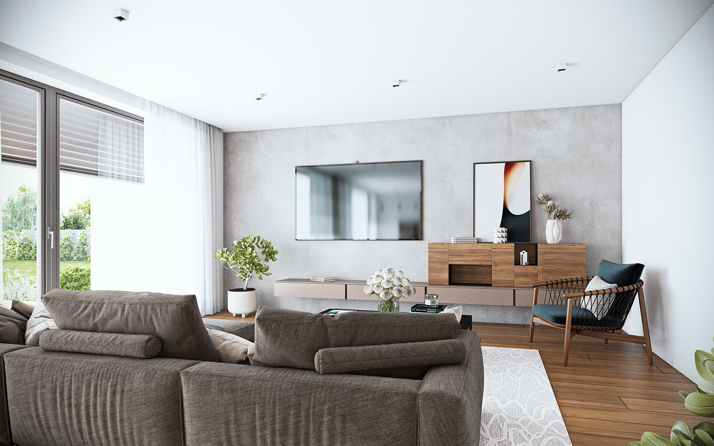 Na pierwszym piętrze znajdziemy pokój dzienny z aneksem kuchennym, gabinet oraz wydzieloną toaletę. Na drugim piętrze znajduje się strefa wyciszenia, w której znajdują się dwa pokoje dziecięce, łazienka z WC, sypialnia z oddzielną łazienką oraz garderoba.