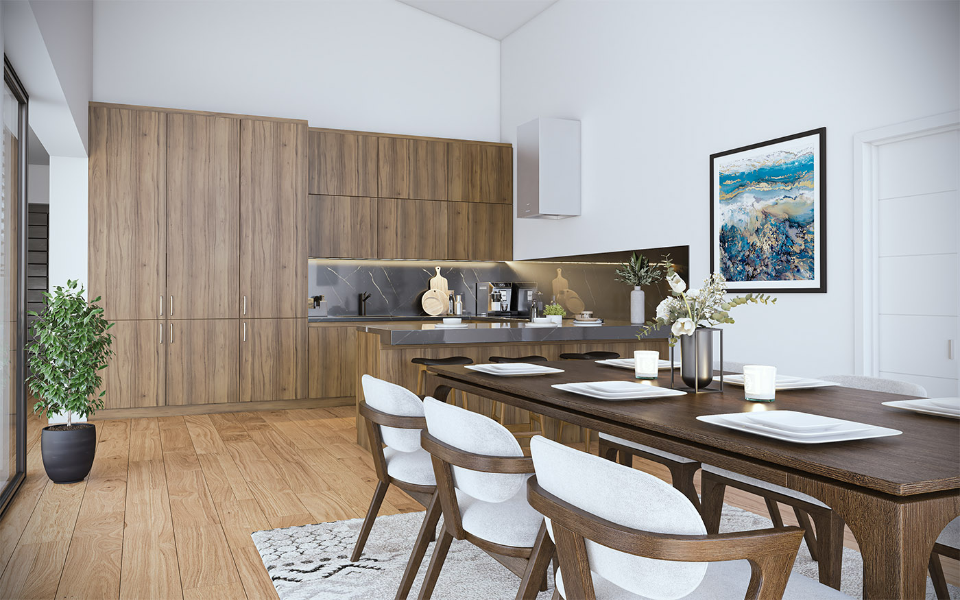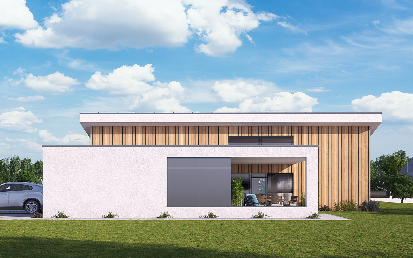 Następnie pod dachem blatu umieszcza się układ 4+kk, w którym nacisk położono na podział na strefy zapewniający przyjemną obsługę i akustykę w domu. Pokój rodziców z przestronną garderobą i własną łazienką znajduje się tuż przy wejściu do domu, a więc z boku pokoi dziecięcych.